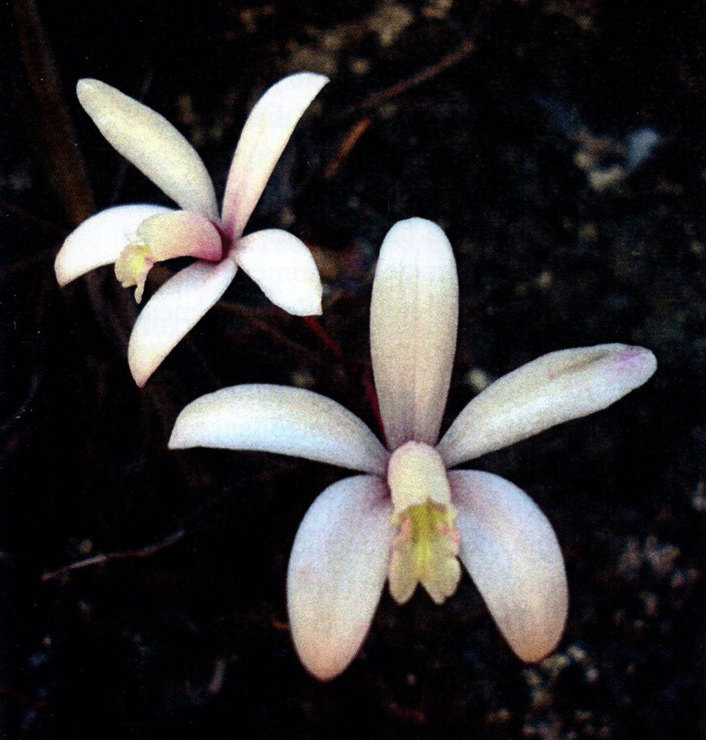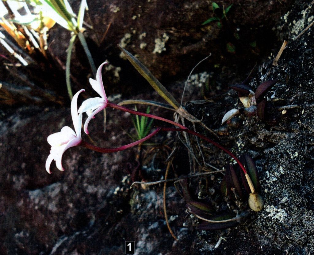 Found in Minas Gerais state of Brazil on rocky outcrops near Velloziaceae with accumulations of organic material at elevations around 1360 meters as a mini-miniature [without inflorescence] sized, cool growing, saxicolus terrestrial with an inconspicuous rhizome giving rise to pyriform-elongate pseudobulbs enveloped by papery, deciduous sheaths and carrying a single, erect, fleshy, leathery, green with red margins, elliptic-lanceolate, conduplicate below into the base leaf that blooms in the winter on a terminal, arising through a linear-truncate, oblique spathe, erect, to 4.4" [11 cm] long, simultaneously 3 flowered inflorescence.