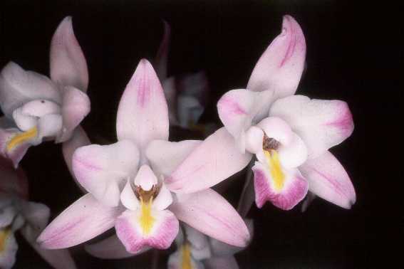 Found in western Mexico in oak or oak pine forests at elevations of 1000 to 2000 meters as a medium sized, cool growing miniature epiphtye or lithophyte with clustered, conical-ovoid pseudobulbs that wrinkle with age, partially enveloped basally by a few scarious, triangular sheaths, carrying 2 to 3, apical, linear-ensiform, coriaceous, somewhat fleshy, dark green, conduplicate below into the clasping base leaves that blooms in the fall and winter on a apical, erect to arching, slender, 4.8 to 24" [12 to 60 cm] long, 2 to 9 flowered racemose inflorescence with closely apressed sheathing bracts all along, arising on a mature pseudobulb and carrying 3 to 10, primrose scented flowers.