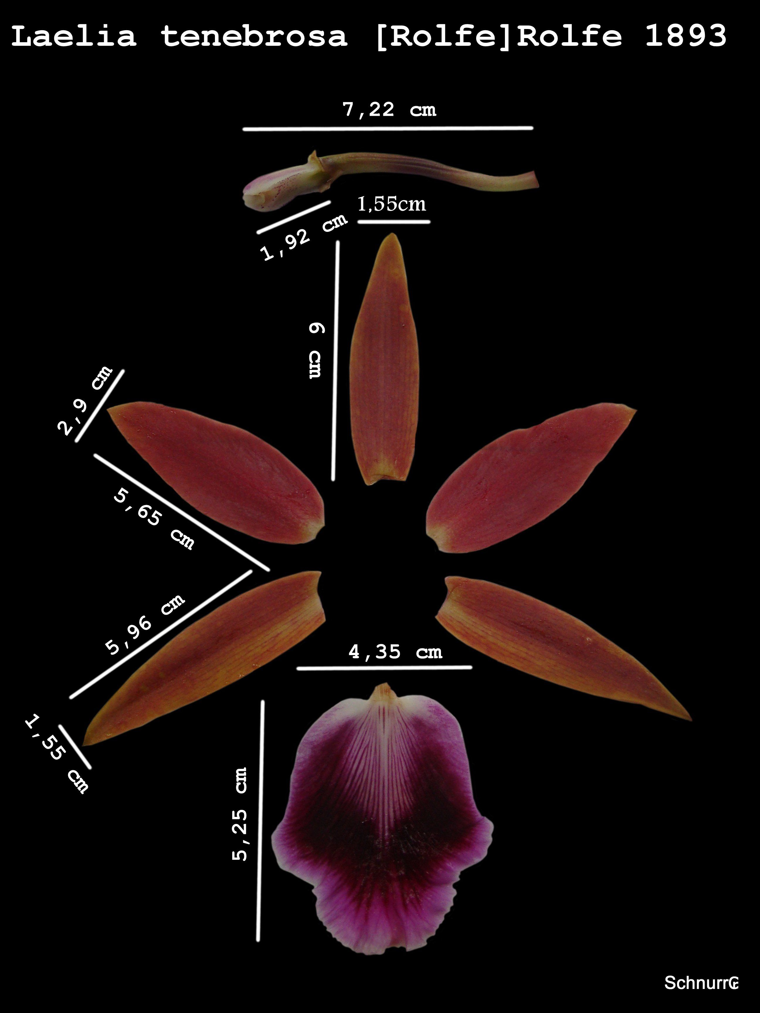 Synonyms Brasilaelia tenebrosa (Rolfe) Campacci 2006; Cattleya tenebrosa (Rolfe) A.A.Chadwick 2006; Chironiella tenebrosa (Rolfe) Braem 2006; Hadrolaelia tenebrosa ( Rolfe ) Chiron & V.P.Castro 2002; *Laelia grandis var. tenebrosa Rolfe 1891; Laelia tenebrosa var. pittiana O'Brien 1894; Sophronitis tenebrosa (Rolfe) C. Berg & M.W. Chase 2000
