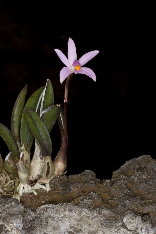 Found in the state of Minas Gerais in mountains in rock fissures at elevations of 1500 to 2000 meters with hot humid summers and cold, dry winters as a mini-miniature sized, cool growing lithophyte with clustered, almost globose pseudobulbs carrying a single, erect, thick, leathery , rigid, often purple suffused, succulent, scoop shaped, narrowly oblong to narrowly ovate, acute leaf that blooms in the late spring and summer on a terminal, 2 to 3" [5 to 7.5 cm] long, simultaneously 1 to 5 flowered inflorescence.