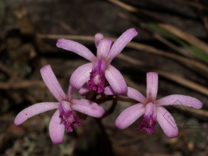 Found in Espirito Santo state of Brazil at elevations around 1100 to 1300 meters as a mini-miniature sized, cool growing rupicolous lithophyte with cylindrical shaped, reddish pseudobulbs carrying a single, reddish tinged leaf that blooms in the winter in Brazil on a terminal, erect becoming arcuate, much longer than the leaf, to 12" [to 30 cm] long, few to several flowered inflorescence holding the flowers towards the apex,