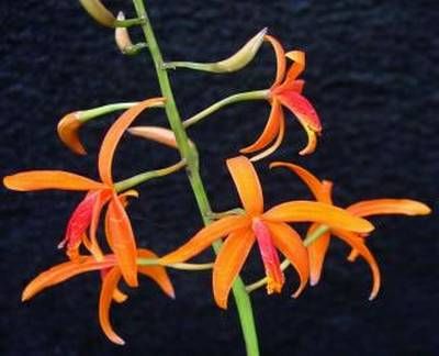 Found in Bahia Brazil without exact locality as a small sized, cool growing epiphyte with somewhat stout, flushed with red pseudobulbs carrying a single, apical, erect, flushed with red, tough, leathery, roughened surface, oblong leaf that blooms in the winter an a terminal, erect, 15.2" [38 cm] long, to 12 flowered inflorescence arising through a sheath and holding the flowers above the leaves