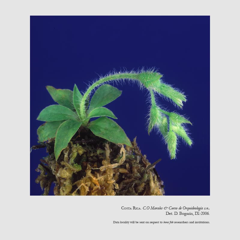 Found in Venezuela, Colombia, Ecuador and Peru in cloud forests at elevations of 1300 to 2000 meters as a small sized, cool growing epiphyte with a basal rosette of ciliate margined, soft, fleshy leaves that blooms in the winter through summer on a somewhat arching, racemose, densely villose, 1" [2.5 cm] long, loosely 5 to 7 flowered inflorescence