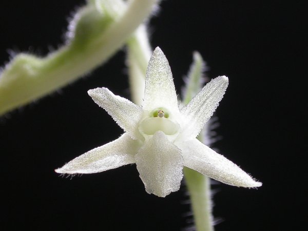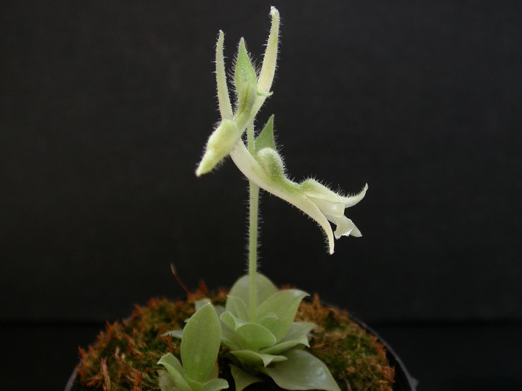 Found in Brazil as a mini-miniature sized, warm to cool growing epiphyte with a basal rosette of lanceolate, obtuse, gradually narrowing into the petiolate base leaves that blooms on a terminal, arching, pubescent, 3" [7.5 cm] long, few to several flowered inflorescence with lanceolate, acuminate, almost as long as the ovary floral bracts