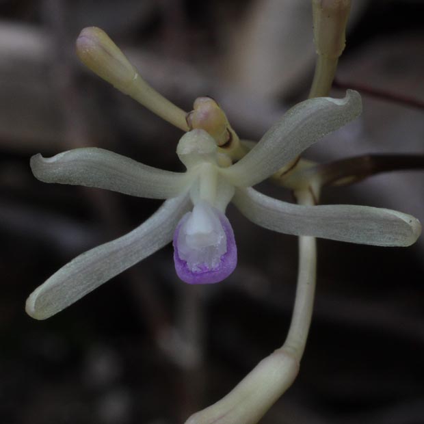 This orchid is similar to L. nigricans Honda, but detailed morphological comparison supports its status as a new species. It is easily distinguished by the following combination of characters: 1) longer stem; 2) longer inflorescence and infructescence, because of longer internodes; 3) yellowish white, narrower sepals and petals; 4) 5-nerved and slightly 3-lobed labellum; 5) bright brown, ascending capsule; 6) column more than half fused with labellum; and 7) column basally pubescent