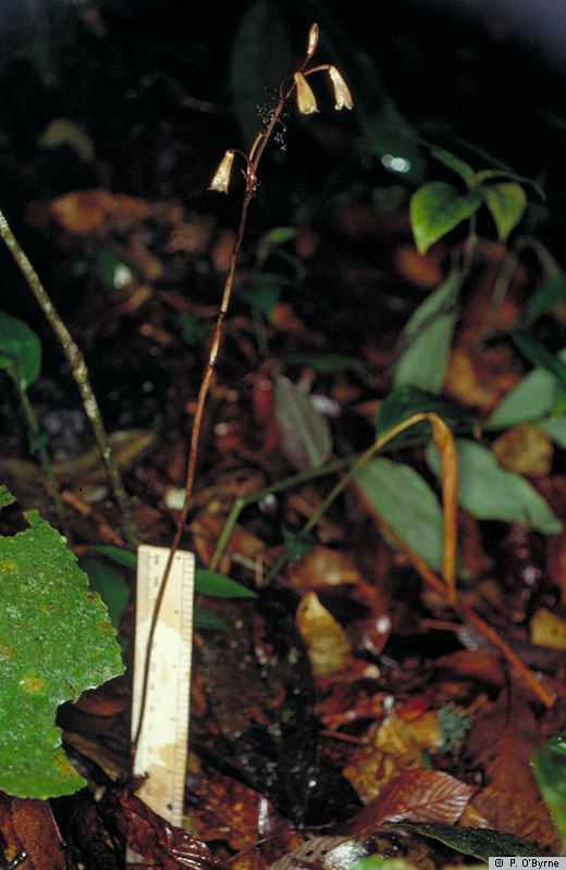Found in Taiwan, Thailand, Vietnam, Malaysia, Java, New Guinea and the Philippines in dark humid forests at elevations of 300 to 1600 meters as a small to medium sized, hot to cool growing mycoheterotrophic terrestrial with an above the ground, vertical and branched rhizome giving rise in the spring to a thin, brittle, light to dark brown, to 20" [40 cm] long stem with ovate-lanceolate, glabrous, smooth to minutely muricate bracts and carrying 3 to 7, widely spaced flowers
