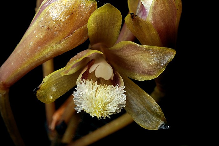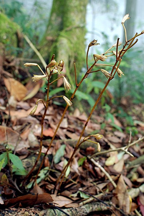 Found in central Taiwan in broad leaved forests at elevations of 1400 to 2000 meters as a medium sized, cool growing mycoheterotrophic terrestrial with an ascending rhizome giving rise to an erect, reddish brown, black spotted, unbranched stem with several dark brown sheaths that blooms in the later spring on an erect, terminal, 1.2" to 1.6" [3 to 4 cm] long, 4 to 10 flowered inflorescence with persistent, ovate floral bracts.
