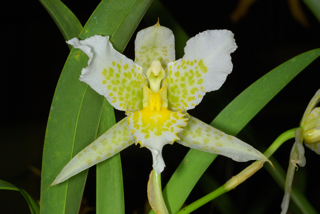 A small to medium sized, cold to cool growing epiphyte, endemic to Sinaloa, Durango, Jalisaco, Michoacan, Guerrerro, Mexico, Moreles, and Oaxaxa states of Mexico in oak-pine forests at elevations of 2000 to 2800 meters, that is a a beautiful member of the genus with a particularly large flower, and wrinkled, ovate, laterally compressed, 3" pseudobulbs emveolped basally by long, triangular, papery, leafless sheaths and are topped with a pair of light green, 10", acute, lanceolate, conduplicate below into the base leaves with pronounced veins. The basal, 5 to 8 " [12.5 to 20 cm] long, 2 to 5 flowered infloresceence emerge with new the growths carrying up to 5, well spaced, showy blooms, the 4" [10 cm] cuppy flowers are crystalline white with bold chocolate brown basal spotting and pointed sepals and petals, arrowhead lip is white with the same brown spotting and a large bright yellow callus and can occur at any time of the year.