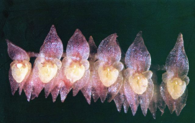 Found in Colombia and Ecuador in montane forests and riversides at elevations around 1000 meters as a mini-miniature sized, warm to cool growing epiphyte with erect, slender ramicauls enveloped by around 5 to 7, lepanthiform sheaths with microscopically scabrous, ribbed, shortly ciliate ostia and carrying a single, apical, erect, coriaceous, elliptic-oblong to elliptic-ovate, subacute to obtuse, cuneate below into the petiolate base leaf that blooms in the fall through winter on a, dense, .56" [1.4 cm] long, 2 ranked, simultaneously several flowered inflorescence.