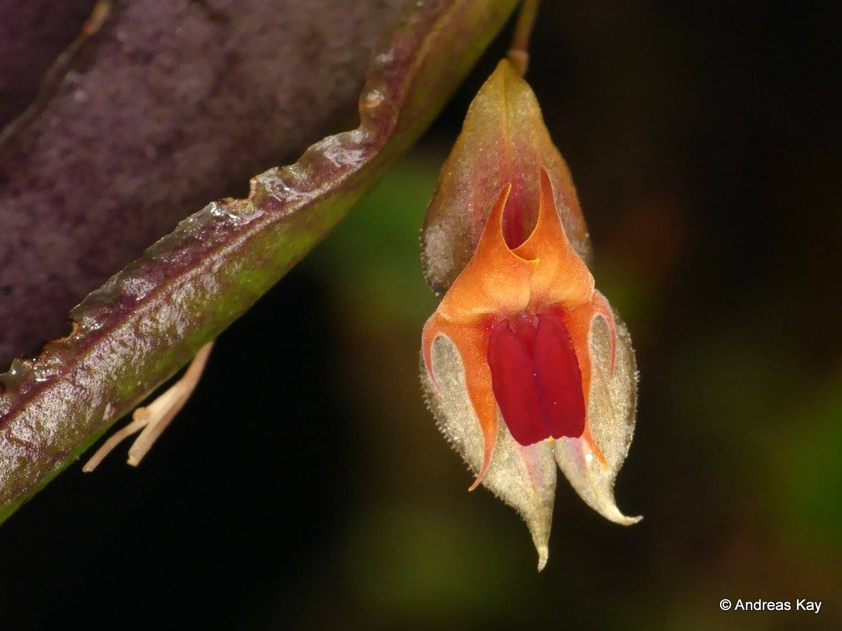 Found in Tungurahua province of Ecuador at elevations around 2000 meters as a mini-miniature sized, cool to cold growing epiphyte with an erect, slender ramicaul enveloped by 7, ciliate, lepanthiform sheaths carrying a single, apical, erect, purple beneath, thinly coriaceous, elliptical, acute to acuminate with a prominent mucro, cuneate below into the petiolate base leaf that blooms in the later fall on a slender, suberect to arching, congested, distichous, to 1.4" [to 3.5 cm] long, successively many flowered inflorescence arising within the dorsum of the leaf.
