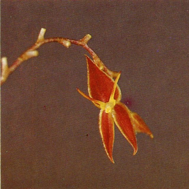 Found in Colombia without collection data as a mini-miniature sized epiphyte with an erect, slender ramicaul enveloped by 7 to 9, ciliate, lepanthiform sheaths and carrying a single, apical, erect, coriaceous, ovate, acute, broadly cuneate below into the petiolate base leaf that blooms in the late winter and early spring on an, erect, filiform, 1" [2.5 cm] long including the .6" [1.5 cm] long peduncle, loose, successively few flowered inflorescence arising on the top side of the leaf.