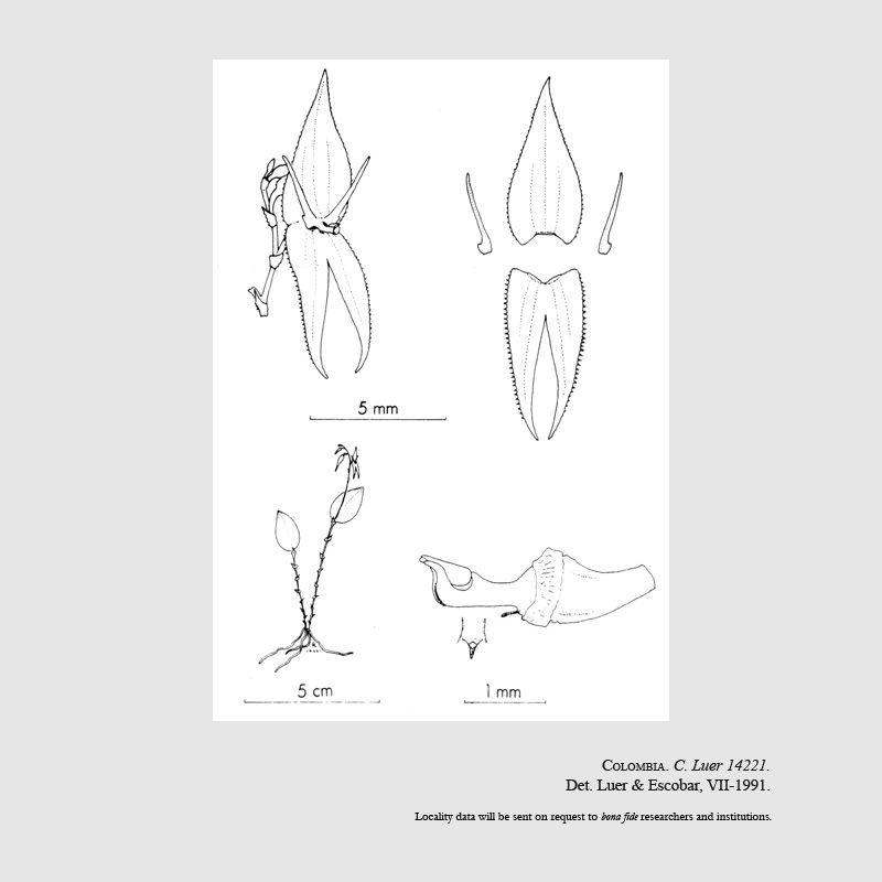 References W3 Tropicos, Kew Monocot list , IPNI ; *Orquideologia Vol 18 No 1 pg 22 1991 drawing fide; Icones Pleurothallidinarum Vol XXXII 2012 drawing fide; Orchids A Colombian Treasure Vol 3 Ortiz & Uribe 2019 drawingfide;