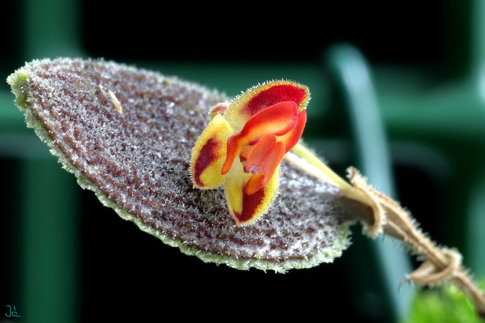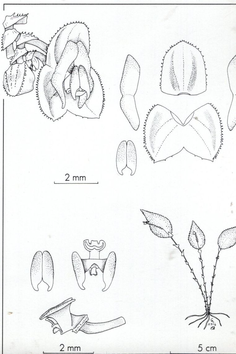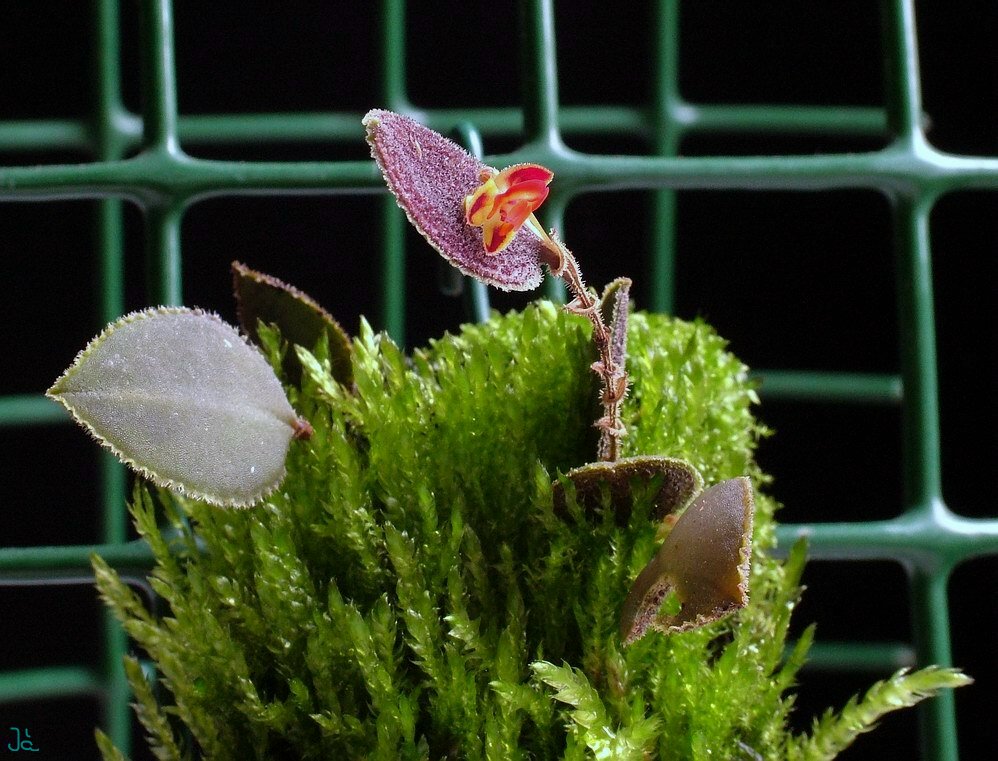 Found in Ecuador and Peru on the eastern slopes of the Andes at elevations of 1000 to 2000 meters as a mini-miniature sized, cool growing epiphyte with erect, slender ramicauls enveloped basally by 7 to 15, long ciliate, lepanthiform sheaths with widely dilated ostia and carrying a single, apical, erect, coriaceous, ovate, slightly acuminate, acute, gradually narrowing below into the elongate petiolate base leaf that has erose lacerate margins and the underside covered by numerous, small, depressions and excavations with elevated ridges covered in short brushy hairs and the dorsal side is smooth. The bloom time is in the spring through summer on a congested, .8" [2 cm] long, filiform, successively many flowered, racemose, inflorescence arising on the back of the leaf.
