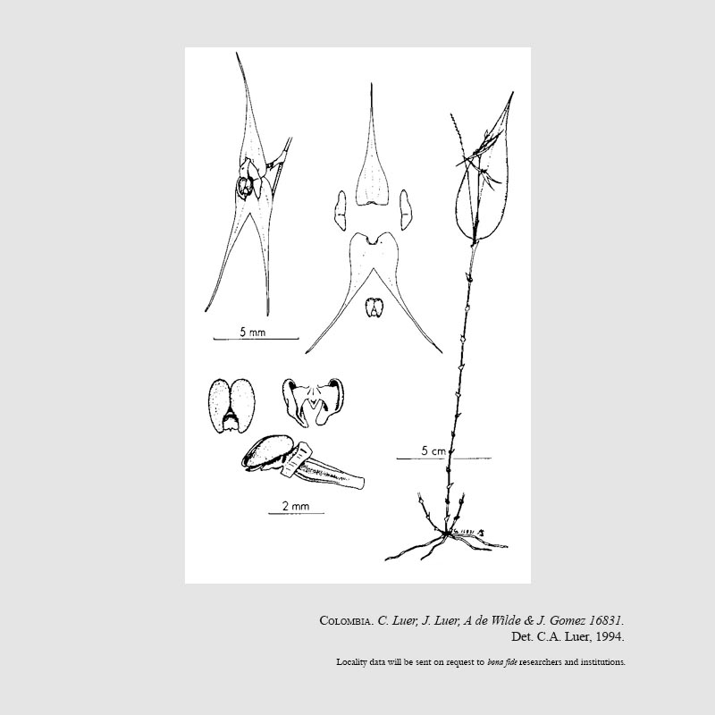 References W3 Tropicos, Kew Monocot list , IPNI ; * Orquideologia Vol 19 #2 pg 73-83. Luer & R.Escobar 1994 drawing/photo fide; Native Colombian Orchids Vol 5 COS 1994 photo fide; Icones Pleurothallidinarum Vol XXXII 2012 drawing fide; The Orchid Review Vol 127 No 1328 December 2019 photo fide; Orchids A Colombian Treasure Vol 3 Ortiz & Uribe 2019 drawing/photo fide;
