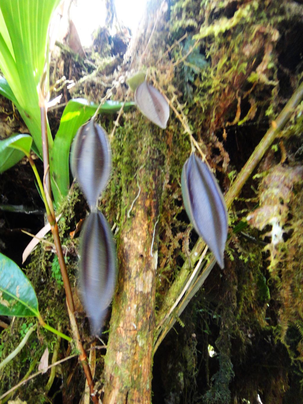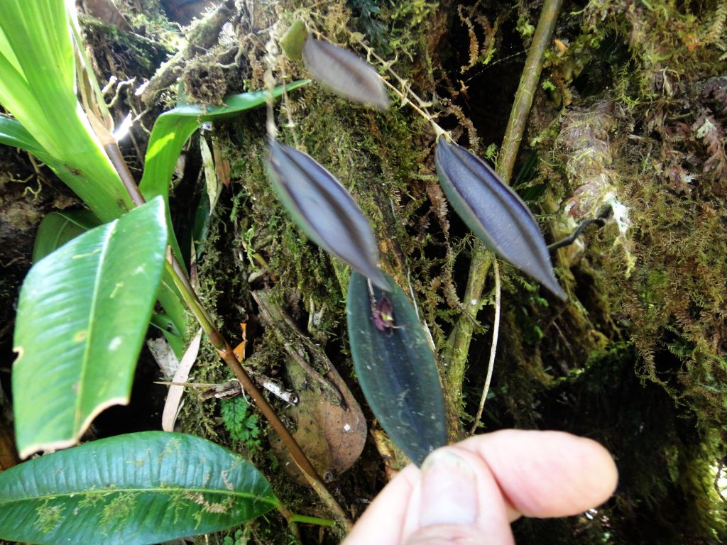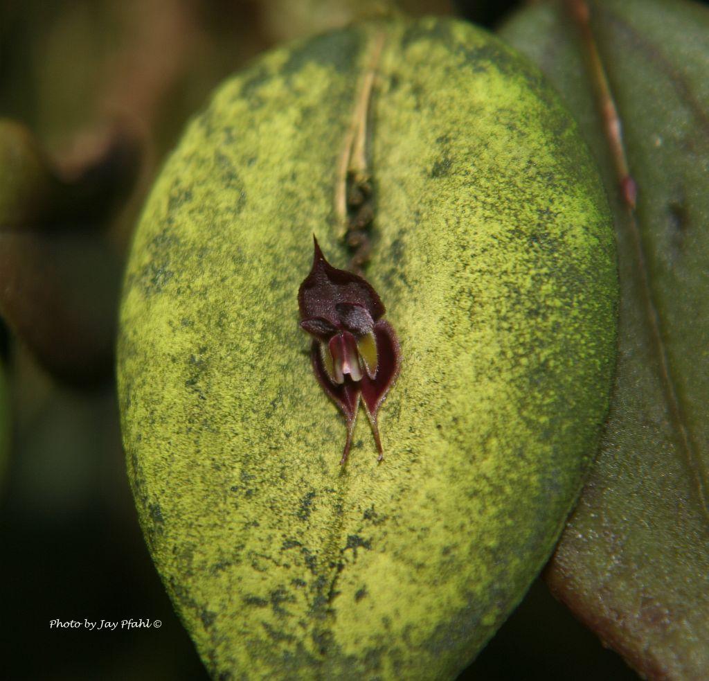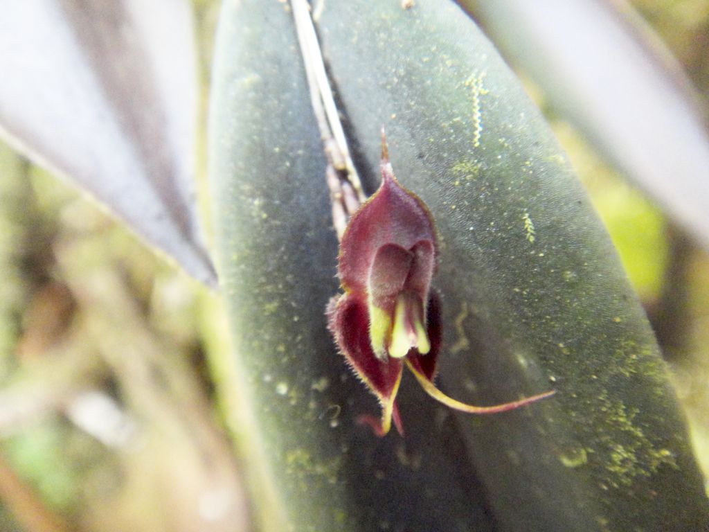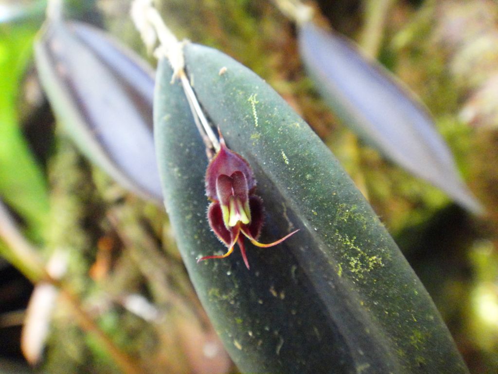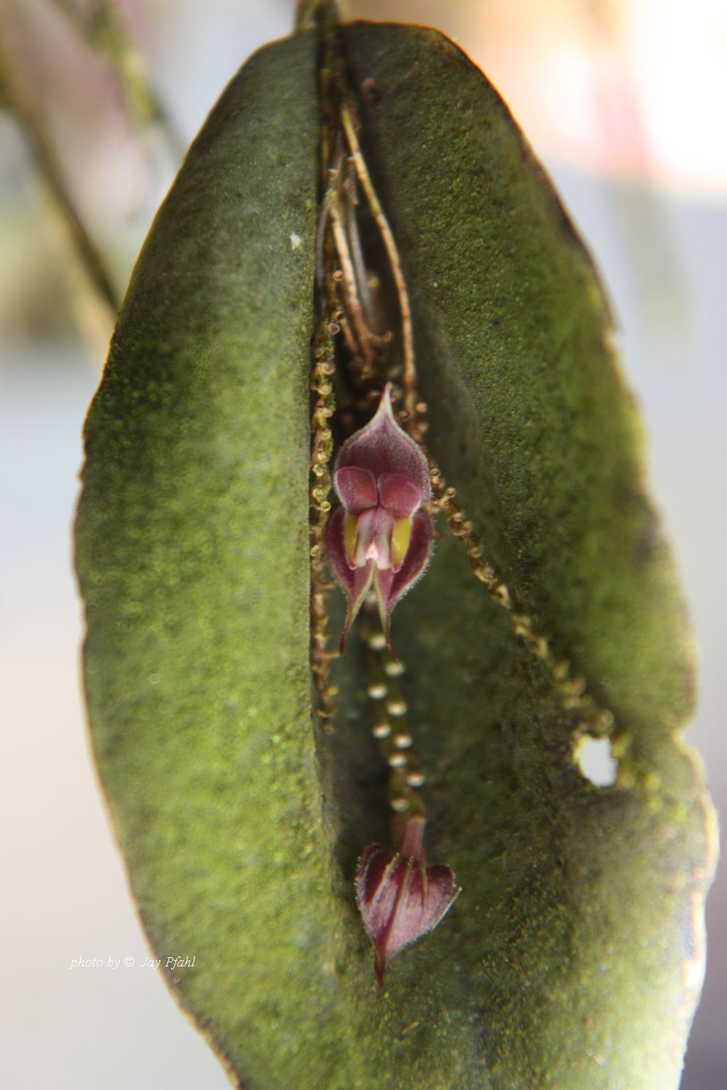Found in Colombia and northern Ecuador in cloud forests at elevations of 1600 to 2500 meters as a miniature sized, cool to cold growing epiphyte with suberect to erect, slender ramicauls enveloped by 4 to 12 minutely pubescent, lepanthiform sheaths carrying a single, apical, erect, coriaceous, suberect to horizontal, finely pubescent, ovate leaf that is dark green with purple beneath and somewhat reticulate that is always in bud or flower on an elongating, 2 1/4" [6 cm] succesively single flowered inflorescence arising from the leaf base and held against the leaf.