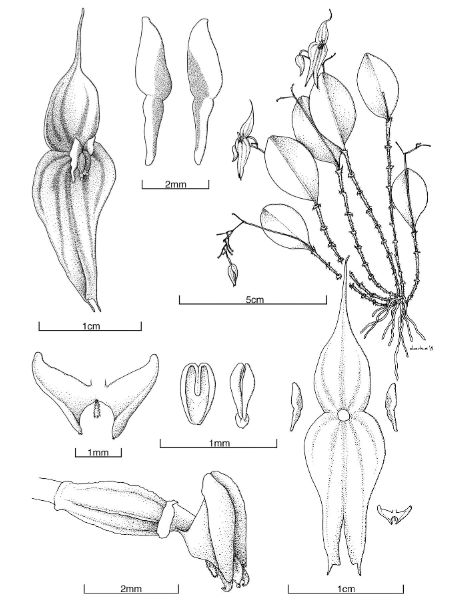 Found in southeastern Costa Rica and western Panama lower wet montane forestss at elevations around 2100 to 2500 meters as a small sized, cold growing, densely caespitose epiphyte with ascending to erect, stout ramicauls enveloped by 5 to 22 lepanthiform sheaths, long cilate aalong the thickened ribs, dilated at the apex into a horizontal, ovate, acute ostia with densely ciliate margins and carrying a single, erect, subcoriaceous, elliptic, acute, emarginated with a short apiculous at the apex, cuneate below into a distinct petiolate base leaf that blooms in the fall on a dense, distichous, borne by a filiform peduncle 1.4 to 1.8" [4 to 4.8 cm] long, 3.2" [8 cm] long overall, successively single, up to 20 or more flowered inflorescence with broadly ovate-triangular, cucullate, obtuse, sparsely glandular, shorter than the pedicel floral bract.