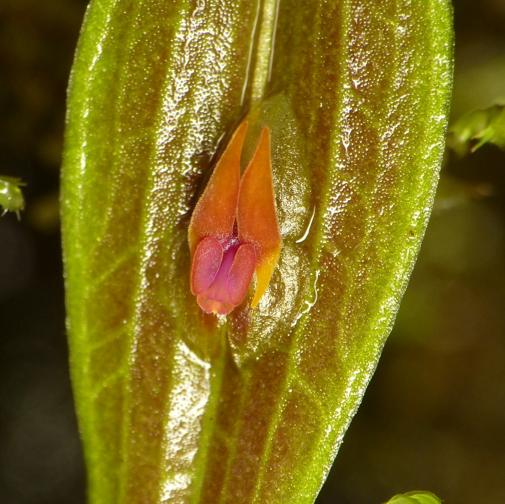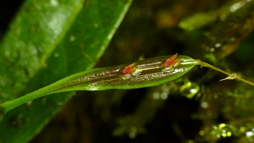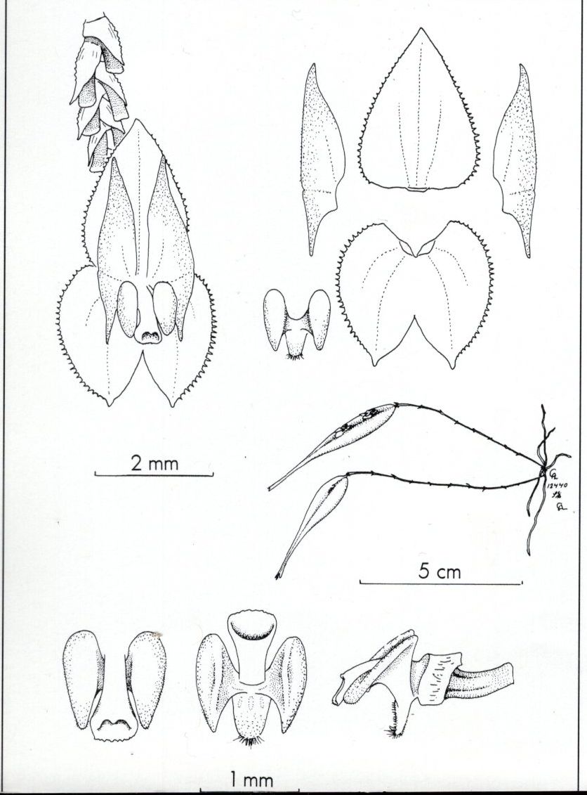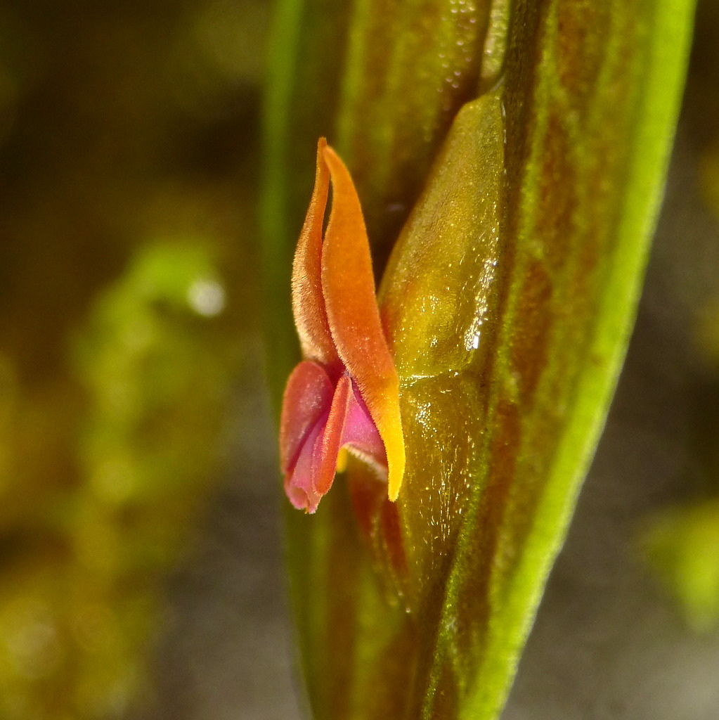 "Characterized by the very thin, weak ramicauls, spreading narrowly ovate leaves suffused with red but with green margins, transverse petals with lobes long-pointed, a bilaminate lip with the very small laminae flanking the column and a large oblong, dscending appendix with a tuft of long hairs on the rouned apex." Luer 1996