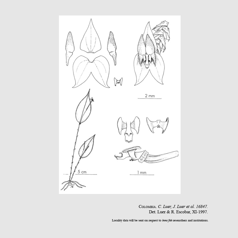 References W3 Tropicos, Kew Monocot list , IPNI ; * Orquideología Vol 20 #3 pg 281–283, f. 111. Luer & Escobar 1997 drawing fide; Icones Pleurothallidinarum Vol XXXII 2012 drawing fide; Orchids A Colombian Treasure Vol 3 Ortiz & Uribe 2019 photo fide;