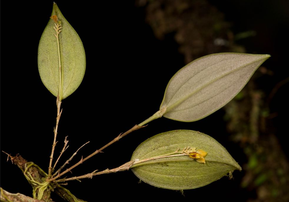 Found in Risaralda department of Colombia in wet forests at elevations around 1630 meters as a miniature sized, cool growing epiphyte with slender, erect ramicauls enveloped by 7 to 11, microscopically ciliate, lepanthiform sheaths and carrying a single, apical, erect, thinly coriaceous, ovate, acute, rounded to broadly cuneate below into the petiolate base leaf that blooms in the later spring on a congested, distichous, filiform, 1.4 to 1.6" [3.5 to 4.5 cm] long including the .6 to 1" [1.5 to 2.5 cm] long peduncle, successively single, many flowered inflorescence with lightly muriculate floral bracts and holding the orange flower well above the leaf base but often still on the leaf.