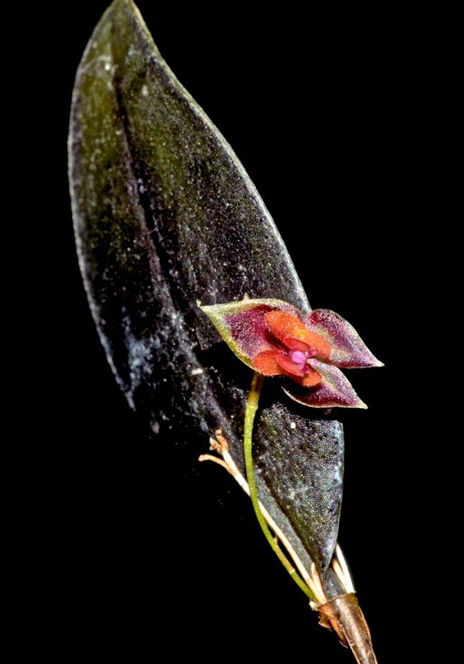 Found in Risaralda and Valle de Cauca departments of Colombia at elevations around 2280 meters as a mini-miniature sized, cold growing, caespitose epiphyte with slender, erect ramicauls enveloped by 6 to 7, microscopically ciliate lepanthiform sheaths and carrying a single, purple suffused beneath, purple margined, erect, coriaceous, elliptical-ovate, acuminate, basally rounded and contracted intothe petiolate base leaf that blooms in the winter on a slender, arisng on the back of the leaf, .28 to .32" [7 to 8 mm] long, congested, distichous, successively single, several flowered inflorescence with shorter than the ovary floral bracts and carrying purple suffused sepals with the margins green, orange petals that are red at the base, and a red lip.