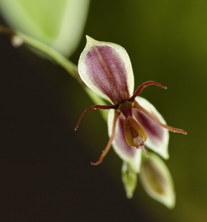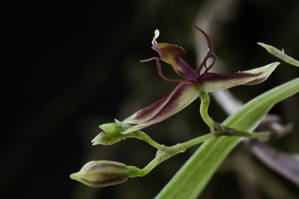 Found in Bolivar state of Venezuela and Colombia in rather scrubby, dwarf cloud forests at elevations around 2600 to 2950 meters as a mini-miniature sized, cold growing epiphyte with erect ramicauls enveloped basally by 5 to 8, inflated, acuminate, imbricating lepanthiform sheaths and carrying a single, apical, erect, coriaceous, obtuse and mucronate apically, gradually narrowing below into the petiolate base leaf that blooms in the spring on an erect, to 2.4" [6 cm] long, fractiflex, successively single flowered inflorescence with triangular, acuminate bracts.