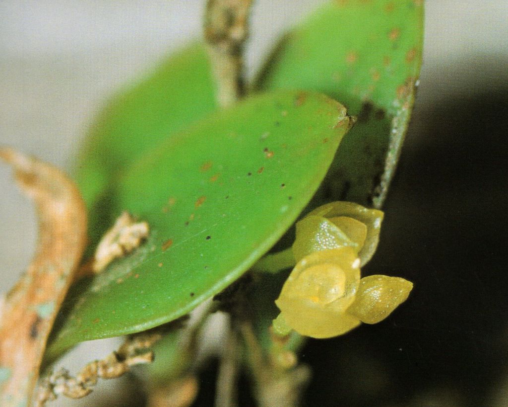 Found in Cuba and Jamaica at elevations of 650 to 2300 meters as a mini-miniature sized, warm to cold growing epiphyte with erect slender, ramicauls enveloped by 2 to 3, microscopically scabrous, lepanthiform sheaths and carrying a single, apical, erect, coriaceous, broadly elliptic, obtuse to rounded, cuneate below into the petiolate base leaf that blooms in the summer and fall on a congested, filiform, .2" [5 mm] long including the .08 to .16" [2 to 4 mm] long peduncle, successively single few flowered inflorescence arising from near the apex of the ramicaul.