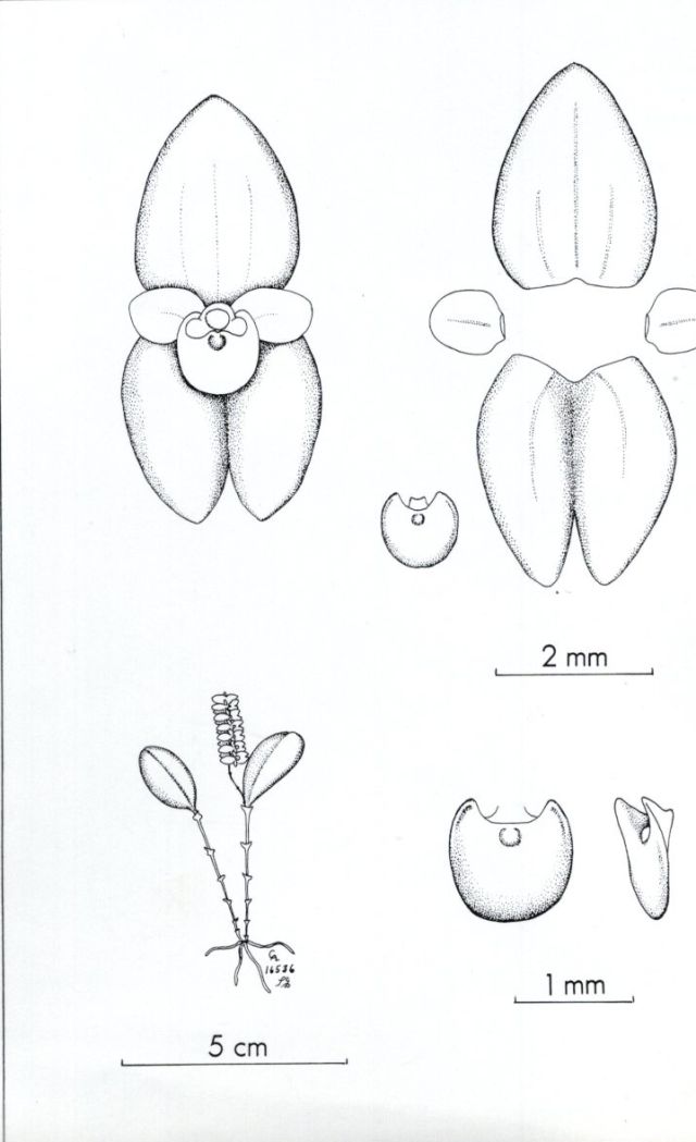 "This species has elliptic leaves with smooth margins. A short peduncled the tip of the crowded raceme of back to back flowers beyond the leaf. The broadly ovate sepals and suborbicular petals are deep purple and convex. The lip is suborbicular with short, basal angles embracing the column." Luer 2002