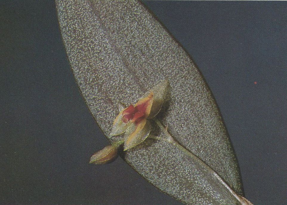 Found in Antioquia department of Colombia at elevations of 2000 to 2200 meters as a mini-miniature sized, cold growing epiphyte with slender, erect ramicauls enveloped by 4 to 6, close, minutely ciliate, leapanthiform sheaths and carrying a single, apical, erect, coriaceous, elliptical, acute, cuneate below into the petiolate base leaf that blooms in the later spring on an erect, on the back side of the leaf, racemose, as long as the leaf, peduncle .4" [1 cm] long, filiform, .8 to 1.4" [2 to 3.5 cm] long overall, rachis to .6" [1.5 cm] long, congested, successively single, several flowered inflorescence with apiculate floral bract