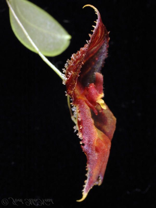 Found in Cochabamba department of Bolivia in cloud forests around 1750 meters as a mini-miniature sized, cool growing epiphyte with erect, slender ramicauls enveloped basally by 7 to 9, minutely ciliate lepanthiform sheaths and carrying a single, apical, erect, broadly elliptical to subcircular, the rounded apex minutely notched, rounded and abruptly contracted below into the petiolate base leaf that blooms in the later falland early winter on a filiform, loose, flexible, to 1.6 to 4" [4 to 10 cm] long, successively single, few flowered inflorescence arising on the top of the leaf.
