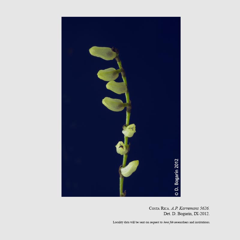Found in El Salvador, Costa Rica, Colombia, Venezuela and Ecuador at elevations of 1100 to 3000 meters as a mini-miniature sized, cool to cold growing epiphyte with erect slender ramicauls enveloped by 4 to 6 close fitting, minutely scabrous lepanthiform sheaths and carrying a single, apical, erect, coriaceous, narrowly ellioptical, acute, cuneate basally into the petiolate base leaf that blooms on a subcongested, 2 ranked, to 3.2" [8 cm] long, simultaneously several to many flowered, racemose inflorescence arising from near the apex of the ramicaul.