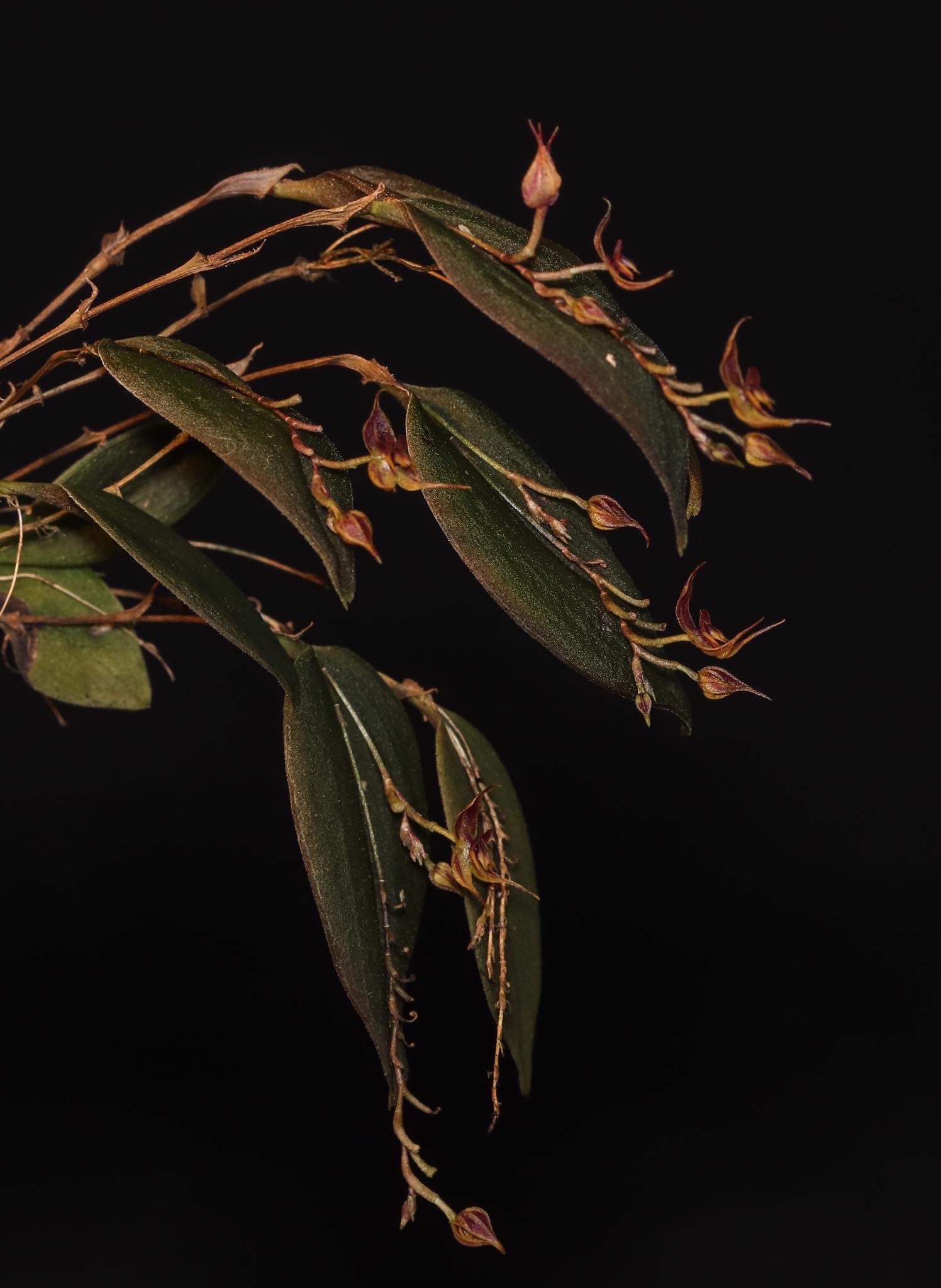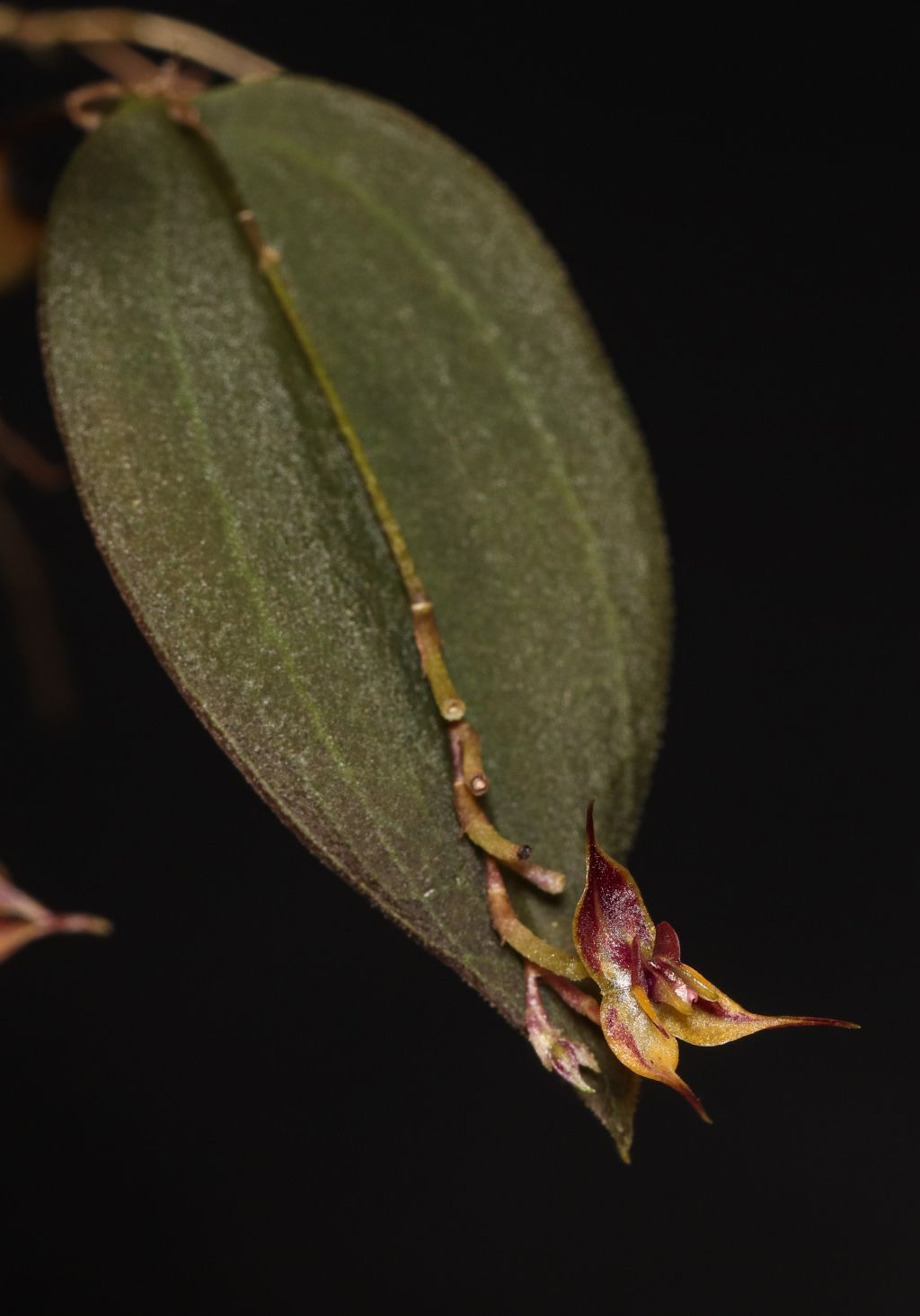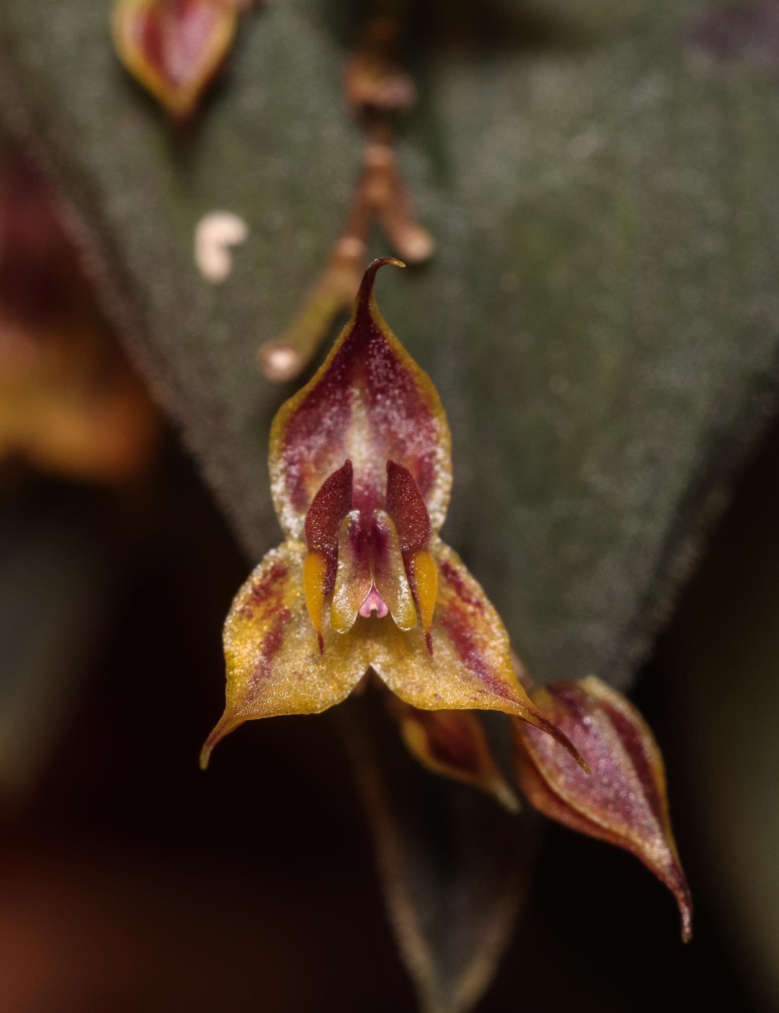 Found in Cotopaxi province of Ecuador at elevations around 1200 meters as a mini-miniature sized, cool growing epiphyte with a slender, erect ramicaul enveloped by 10 to 12, ciliate, lepanthiform sheaths with widely dilated ostia and carrying a single, apical, erect, coriaceous, ovate, acuminate to acute, reticulate and ciliate along the veins beneath, broadly cuneate below into the petiolate base leaf that blooms in the summer on a filiform, erect, congested, .38" [9.5 mm] long, successively several flowered inflorescence arising on the back of the leaf.