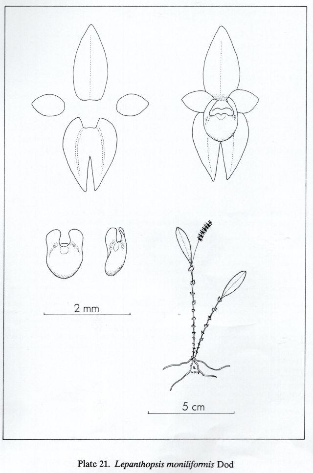 "This species is similar to Lepanthopsis dodii but L moniliformis differs in teh numerous, dark, sheaths af the ramicaul with markedly dilated and ciliate ostia, In common with several other species, the leaves are minutely, cellular-denticulate on the margins. The flowers are dark purple instead of yellow and the petals are obtuse instead of acute and the apex of the lip is rounded." Luer 2000
