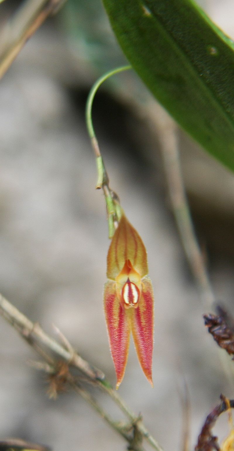 "The large brownish flowers of this species appear singly in a very dense raceme borne by a long, capillary peduncle to overhang or esceed the acuminate apex of the leaf, a habit shared by the Ecuadorian L verspertillo The deep cavity of the body of the lip is reminiscent of the sympatric L foveata.