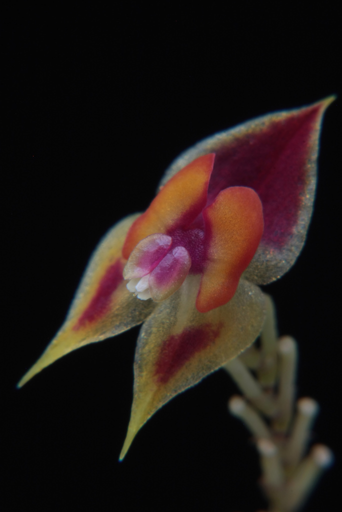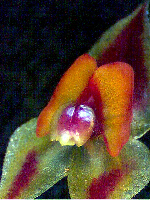 Found in Huanuco department of Peru as a mini-minaiture sized, cool growing epiphyte with slender, erect ramicauls enveloped by 6 to 7 ciliate lepanthiform sheaths and carrying a single, erect, coriaceous, narrowly ovate, acute, cuneate below intothe petialate base leaf that band blooms in the summer and fall on an erect, arising from behind the leaf, peduncle .2" [5 mm] long, cvongested, successively single, several flowered inflorescence with as long as the pedicel floral bracts.