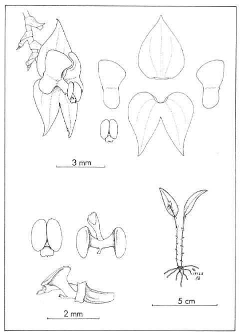 "Characterized by a small, ovate, acute leaf borne by a slightly longer ramicaul. The raceme is short, borne behind the leaf, and successively few-flowered. The sepals are broadly ovate, acute and glabrous. The petals are transversely bilobed with the anterior margins of the truncate, upper lobes in apposition. Borne above the column by elongated connectives, the blades of the lip are elliptical and flat with round ends. The appendix is small, oblong with a pubescent tip" Luer 2002