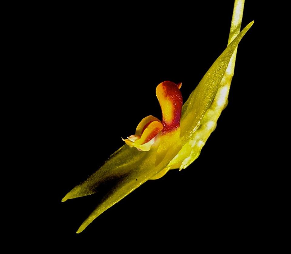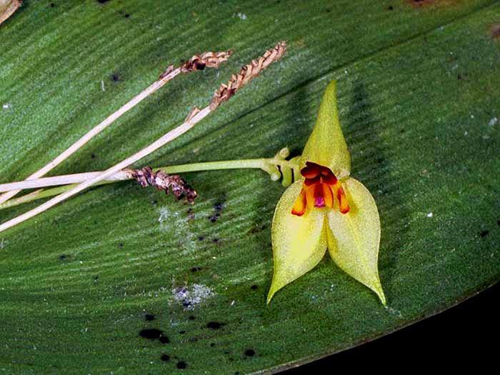 Found in Colombia, Ecuador and Bolivia at elevations of 1400 to 2600 meters as a miniature sized, cool to cold growing epiphyte often occuring near rivers with slender to stout, erect ramicauls enveloped basally by 10 to 16, minutely ciliate, lepanthiform sheaths carrying a single, apical, erect, thinly coriaceous, elliptical, acute, long acuminate leaf with minute cilia along the ventral veins and has a rounded base contracted into a petiole that blooms in the fall on a dense, successively many flowered, racemose, to 1/10" [2 mm] long inflorescence.