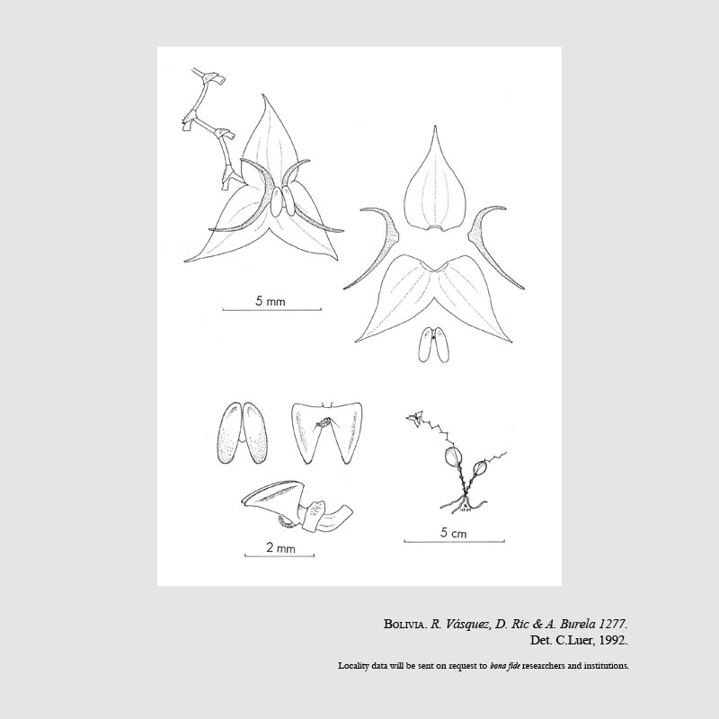 References W3 Tropicos, Kew Monocot list , IPNI ; * Lindleyana 7(2): 100, 102-103, f. 2. 1992 Luer & Vasquez drawing fide; Orchids of Bolivia Vasquez & Ibisch 2000 photo/drawing fide; Icones Pleurothallidinarum Vol XXXI 2010 drawing fide;