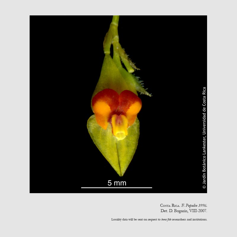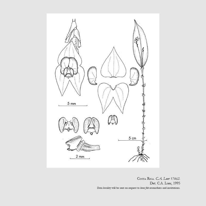 References W3 Tropicos, Kew Monocot list , IPNI ; Lankester's Epidendra Website CR ; * Lindleyana 10: 135. Luer 1995 drawing fide; Manual de Plantas de Costa Rica Vol 3 Hammel, Grayum, Herrera and Zamora 2003; Vanishing Beauty, Native Costa Rican Orchids Vol 2 Lacaena to Pteroglossa Pupulin 2020 photo fide;