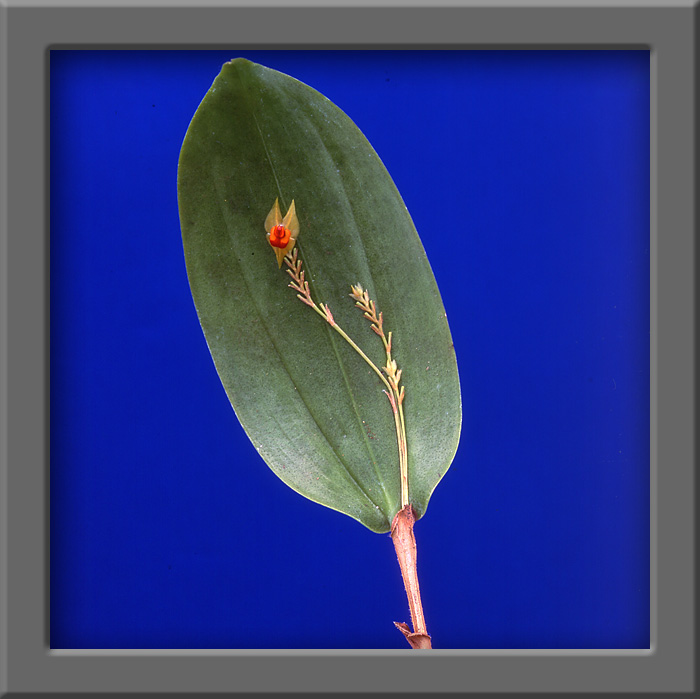 Found in Costa Rica in premontane rain forest to cloud forest and disturbed primary forests at elevations around 1850 meters as a mini-miniature sized, cool growing epiphyte with stout, erect ramicauls enveloped by to 15 to 16 lepanthiform sheaths with ciliate ostia and carrying a single apical, erect, coriaceous, elliptical, subacute, acuminate, gradually narrowing and cuneate below into the petiolate base leaf that blooms in the spring on an erect, arising on the back side of the leaf, peduncle slender, 1.2 to 1.6" [3 to 4 cm] long, rachis .4" [1 cm] long, congested, successively single, several flowered inflorescence with oblique, lightly muricate, as long to just shorter than the pedicel floral bracts