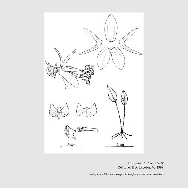References W3 Tropicos, Kew Monocot list , IPNI ; *Orquideologia 19: 96 Luer 1994 drawing fide; Native Colombian Orchids Vol 5 COS 1994 photo fide; AOS Bulletin Vol 64 No 10 1995; Orquideología Vol 21 #2 og 140–142, f. 133. Luer & Escobar 1999 as L bifurcata drawing fide; Orchids A Colombian Treasure Vol 3 Ortiz & Uribe 2019 drawing/photo fide; Checked Type w3tropicos fide
