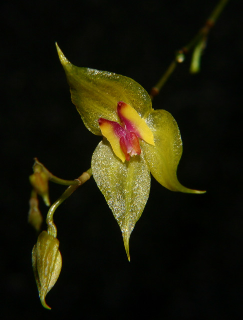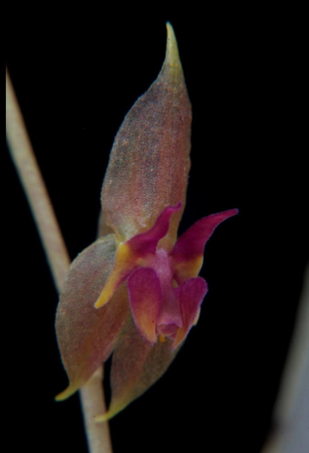 Found in Colombia and western Ecuador in cloud forests at elevations around 2100 to 3600 meters as a miniature sized, cold growing epiphyte with slender to stout, erect ramicauls enveloped by 5 to 17, minutely ciliate-scabrous lepanthiform sheaths and carrying a single, apical, erect, thinly coriaceous, elliptical-oblong to elliptical ovate, acute to obtuse, shortly or slightly acuminate, cuneate below and contracted into the petiolate base leaf that blooms at any time of the year on a slender, distichous, to 1.6" [to 4 cm] long, filiform, successively many flowered, racemose inflorescence arising from behind the leaf.