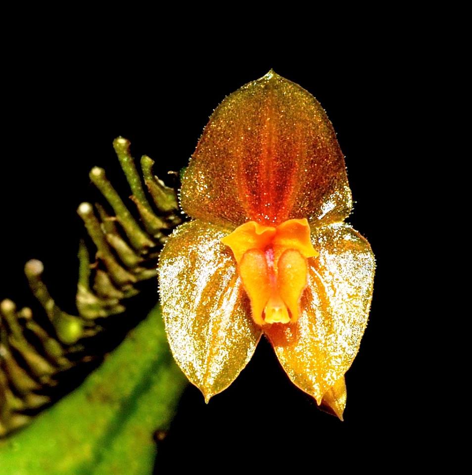 Found in Narino department of Colombia near la Laguna de la Cocha at elevations above 2500 meters as a miniature to small sized, cold growing epiphyte with erect, stout ramicauls enveloped by 10 to 11, glabrous, tubular lepanthiform sheaths with obliquely dilated ostia and carrying a single, coriaceous, erect, ovate, acute, acuminate rounded and contracted below into the petiolate base leaf that blooms in the later spring on a slender, sublax, 5.4" [13.5 cm] long including the 1.4" [3.5 cm] long peduncle, successively many flowered inflorescence arising on the back of the leaf.