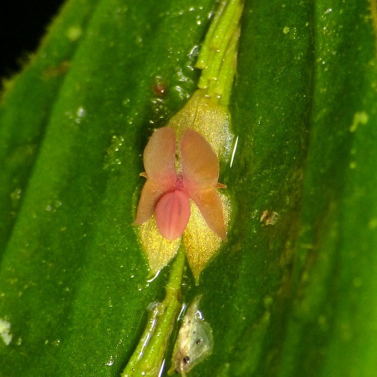 Found in northwestern Ecuador at elevations around 750 meters as a miniature sized, warm growing epiphyte with a weak, suberect, slender ramicaul enveloped by 7 to 13, close, minutely ciliate lepanthiform sheaths carrying a single, apical, suberect to spreading, lightly corrugate-reticulate, thinly coriaceous, ovate, acute, acuminate, rounded and contracted below into the petiolate base leaf that blooms in the summer on a filiform, very congested, secund, to .92" [to 2.3 cm] long, successively many flowered inflorescence with long pedicels and arising on the top of the leaf.