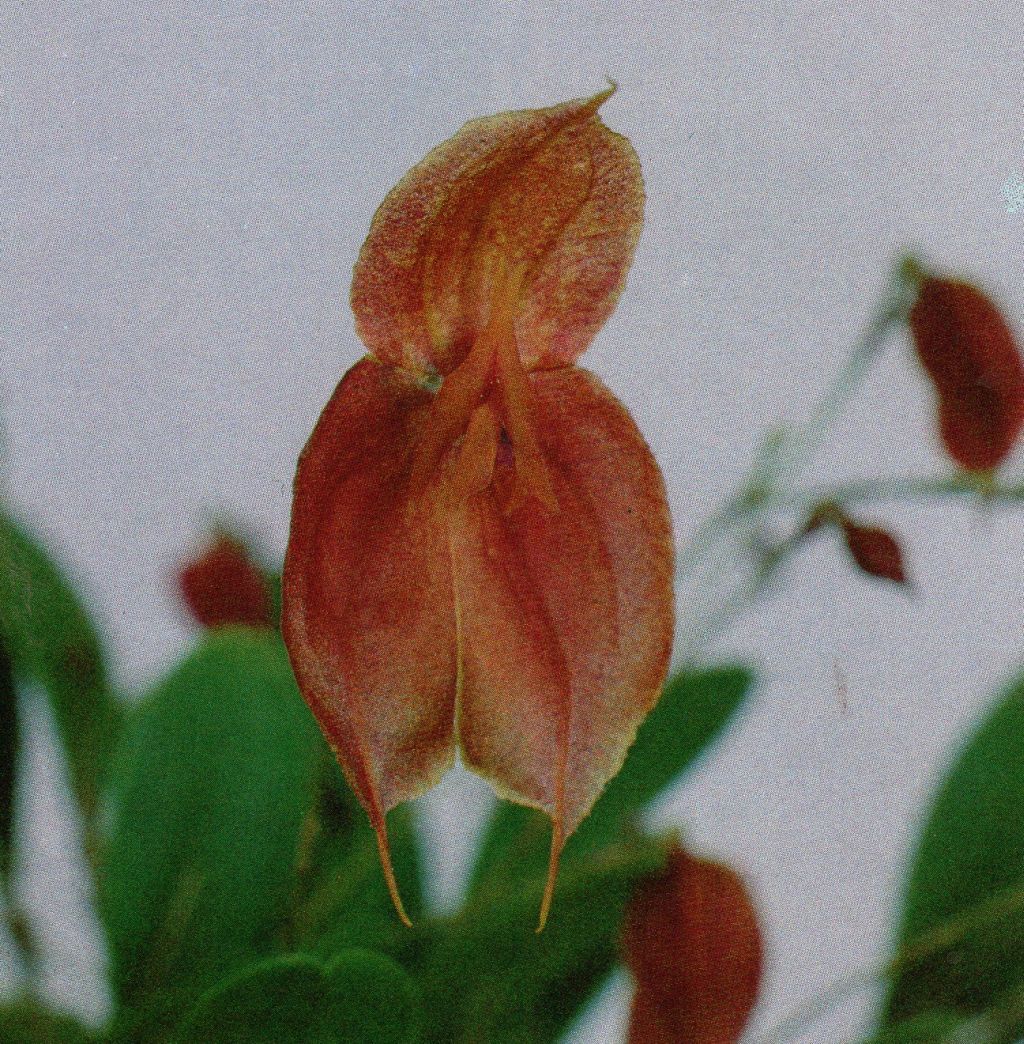 Found in Boyaca department of Colombia at elevations above 2500 meters as a mini-miniature sized, cold growing epiphyte with erect, slender ramicauls enveloped by 3 to 5, minutely ciliate, lepanthiform sheaths and carrying a single, erect, coriaceous, elliptical, subacute, cuneate below into the petiolate base leaf that blooms in the spring on a filiform, erect to arching, flexuous, 1.2 to 1.6" [3 to 4 cm] long including the .6 to 1" [1.5 to 2.5 cm] long peduncle, successively few flowered inflorescence with echinate floral bracts.