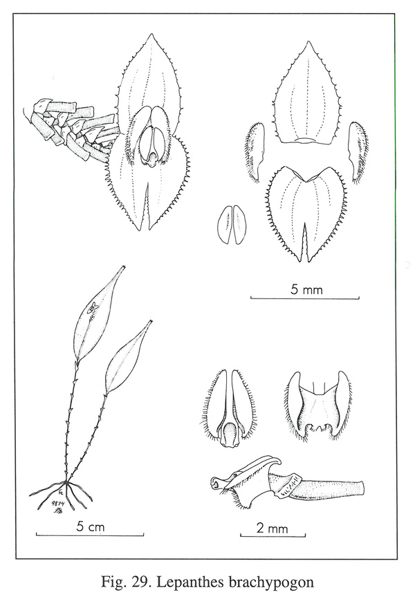 "Characterized by the weak habit, the raceme lying on the narrow, long-acuminate leaf, cilited floral parts, and a descending mentum of the body of the lip witha horizontal pair [sometimes in appostion] of short, pubescent appendices." Luer 1996