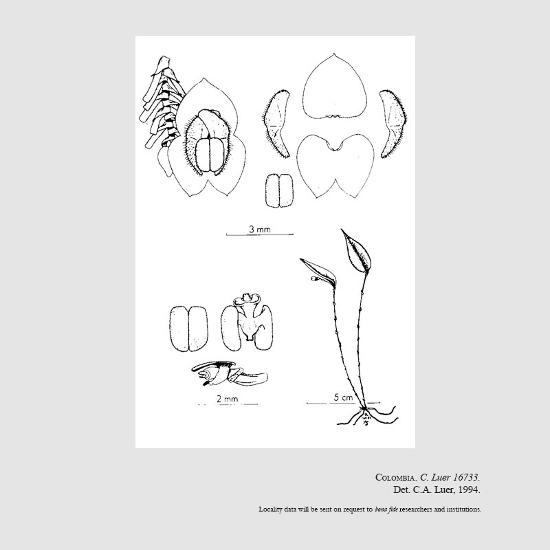 "This little species from the Western Cordillera is distinguished by more or less spreading ovate,lightly acuminate leaves that bear the short, congested raceme on the under surface. The sepals are broad and obtuse. The transverse petals are densely long-pubescent. The thin, oblong blades of the lip are adherent to each other over the column. Each blade is supported by an oblong connective from the basal third. The body is rounded and protruberant with a pubescent, oblong appendix at the summit. The apical stigma is transversely bilobed as seen in Stelis etc." Luer & Escobar 1994