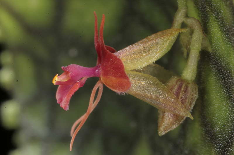 Found in western Colombia and Ecuador in wet montane forests as a miniature sized, warm to cool growing epiphyte at elevations of 450 to 1500 meters that has clustered erect ramicauls enveloped by 2 to 3, obconical, acute, ciliate, lepanthiform sheaths and carrying a densely patterned, satiny, pendant, broadly ovate top, subcircular, obtuse or shortly apiculate leaf that is lime to emerald green and red in color with a congested, fasiculate, subsecund, shorter than the leaves, one to several flowered inflorescence that can occur at any time of the year with very small flowers that open singly in sucession and needs high humidity, constant watering and fertilizer.