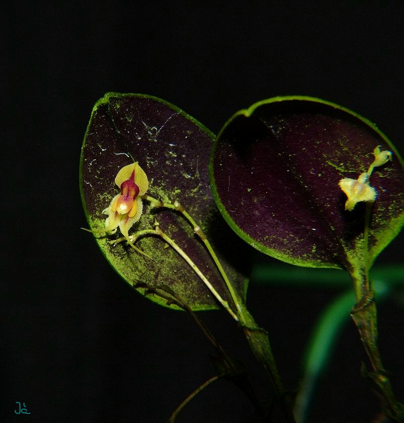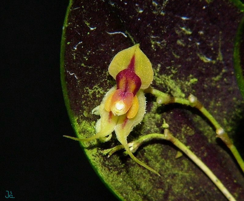 Found in Morona-Santiago and Zamora-Chinchipe provinces of Ecuador in cloud forests at elevations of 1300 to 1900 meters as a mini-miniature sized, cool growing epiphyte with erect, slender ramicauls enveloped by 15 to 17, shortly ciliate, lepanthiform sheaths and carrying a single, apical, erect, coriaceous, purple beneath with green margins, elliptical, subacute, shortly acuminate, cuneate below into the petiolate base leaf that blooms in the winter and spring on a filiform, beneath or on top of the leaf, congested, secund, .7" to 7/8" [1.8 to 2.2 cm] long, successively several flowered, racemose inflorescence