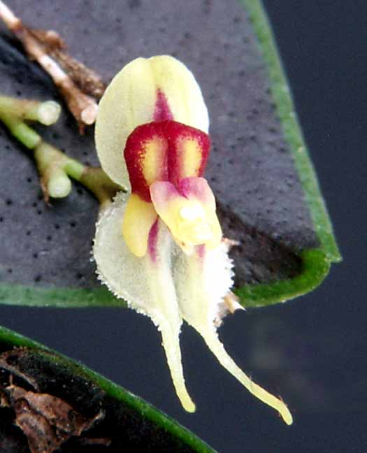 Similar to L pubescens with the long, outwardly curved tails of the lateral sepals but differs in the lateral sepals being one veined and the dorsal sepal is suborbicular with a short reflexed tail.