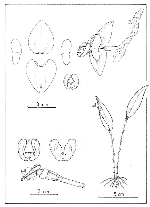 "Characterized by elliptical-ovate leaves slightly longer than the several-flowered raceme; a broadly ovate dorsal sepal, and a similar, but shortly bifid synsepal; bilobed petals with the opposite lobes with rounded ends about equal; and ovate blades of the lip that surround the short, thick column." Luer 2002